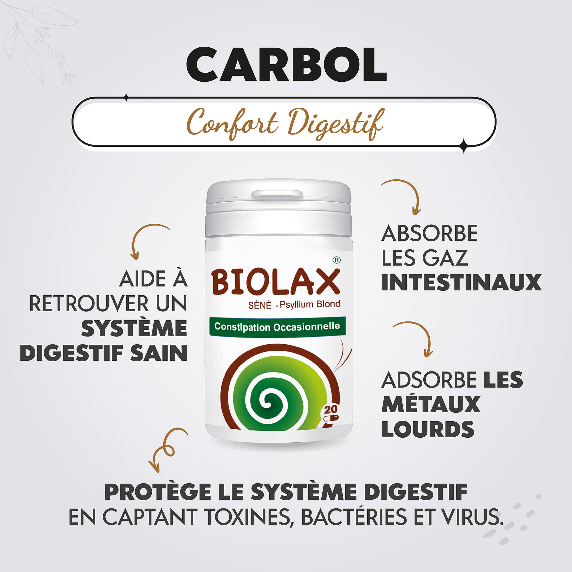 Connu pour favoriser le confort digestif et éviter les ballonnements, le Charbon végétal activé Carbol a été choisi pour sa forte capacité à adsorber les gaz et toxines produits lors de la digestion.