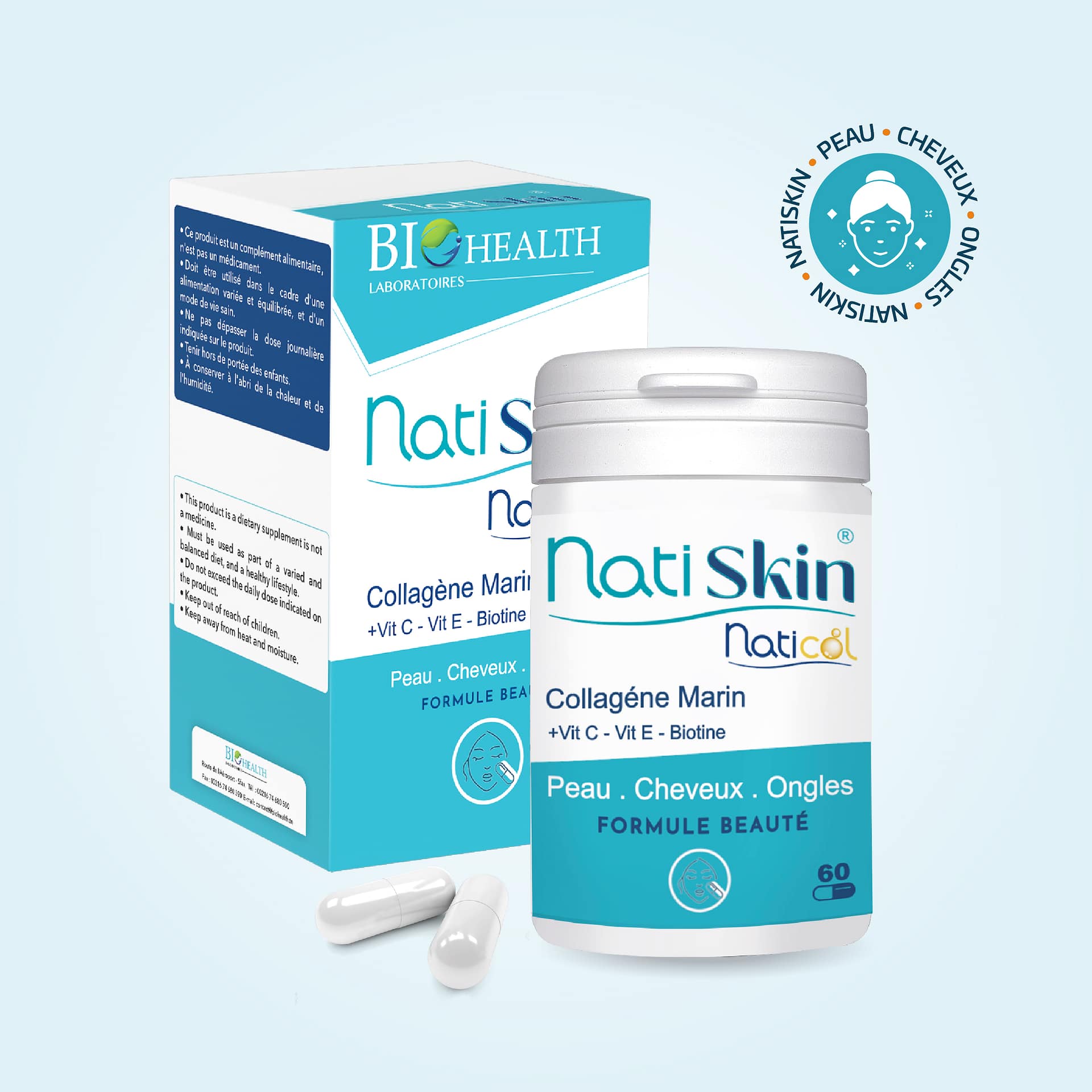NatiSkin est notre formule beauté. Une combinaison innovante de plusieurs actifs à l’action ciblée sur la peau, les cheveux et les ongles.